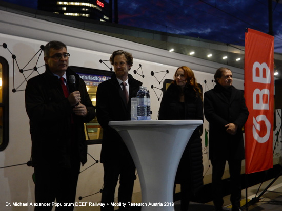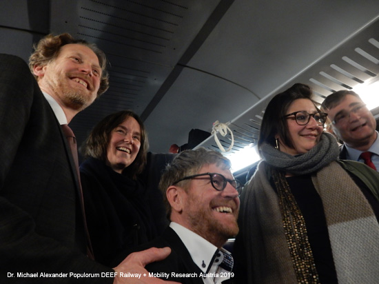 Der Kunstzug, bestehend aus 4 CS-Waggons der ÖBB plus einem Großraumwagen der Slowakischen Staatsbahn, ist mit der Slowakischen Delegation an Bord in Wien Hbf angekommen. Kurze Statements folgen, am Foto von links der Slowakische Botschafter in Österreich, der Österr. Botschafter in der Slowakei, eine Vorständin der ÖBB PV AG, ein Vertreter der Slowakischen Staatsbahn ZSSK in Vertretung des CEO