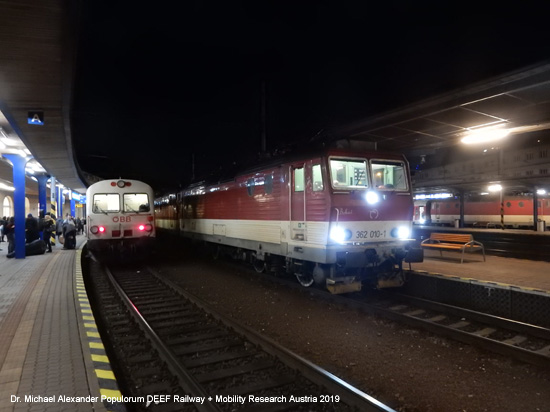 Der Kunst-REX am Hausbahnsteig, auf Gleis 2 ein Slowakischer Schnellzug mit Doppeltraktion, führend 362 010-1