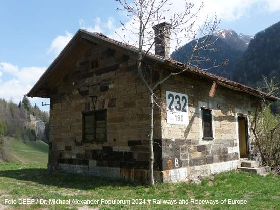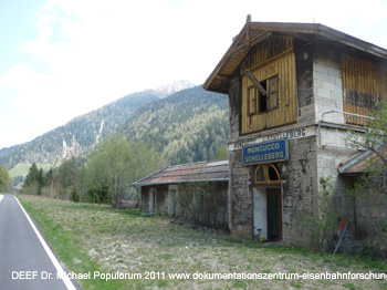 Der Bahnhof von Schelleberg/Moncucco macht einen bedauernswerten Eindruck – noch steht der integrierte hölzerne Wasserturm, aber ein Betreten erschien mir gefährlich und ob des kreuz und quer liegenden Müll auch schwierig. Bleibt abzuwarten was aus der einst von zahlreichen „hochwohlgeborenen“ und bekannten Persönlichkeiten frequentierten Station werden wird. In der Belle Epoque war es ja so, daß zahlreiche Reisende in Schelleberg ausstiegen und den Weg direkt hinab nach Gossensaß zu Fuß zurücklegten, während der Zug noch kilometerlang weiter den Talkessel ausfuhr. In Gossensaß stiegen sie dann wieder zu. Alle Bahnhöfe an der Strecke wurden übrigens von Architekt Wilhelm von Flattich (1826-1900) entworfen. Der Haltepunkt Schelleberg wurde wie die Station Brennerbad 1978 aufgelassen.